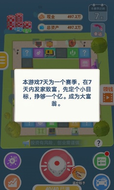 这是一款卡通主题风格的模拟经营类游戏,七天为一个赛季,玩法很简单,投掷骰子不断前进!在游戏中抓住机遇,一夜暴富,让你感受到赚钱的快乐。我们游戏的初衷,是让玩家在娱乐中学习金融知识,老少皆宜,寓教于乐。
