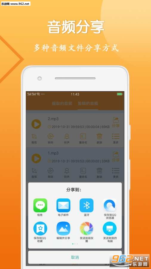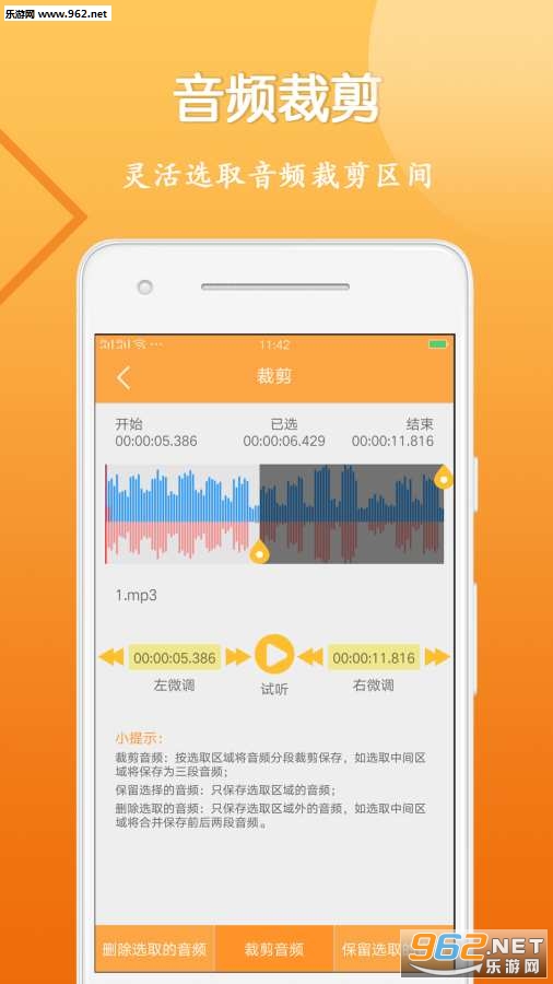 音频剪辑大师支持对音频文件进行裁剪分割,对视频提取的音频文件或手机中的音频自由选择。分割裁剪,保留喜欢的部分!