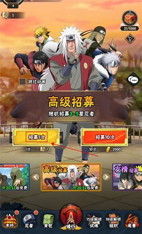 1、进入游戏后,优先前往【忍者招募】界面,抽取并组建初始队伍。