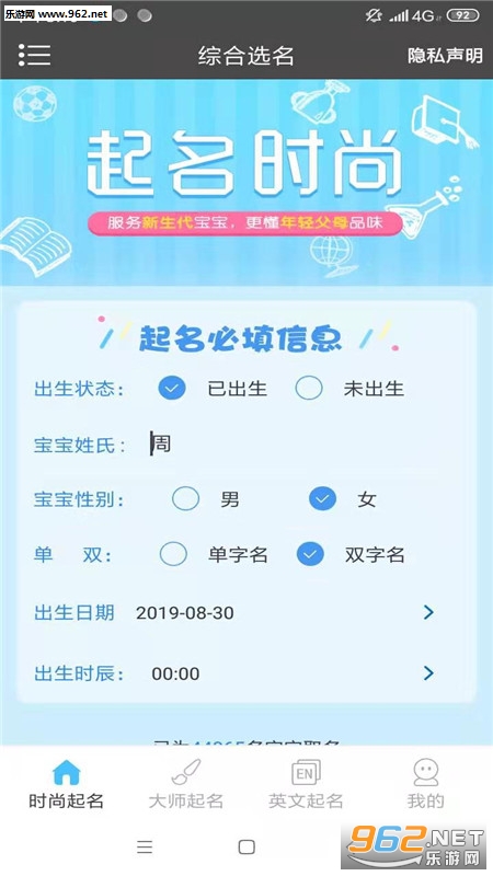 《起名取名宝软件》是上海问礼信息科技有限公司推出的一款手机取名神器,朋友们可以在本款软件中填入一些基本的信息,然后即可自动起名了,有着众多好名字可以挑选,还有着英文名可以选取。