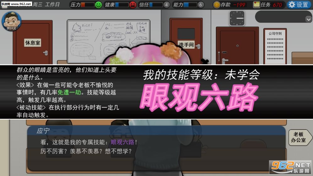 我的公司996破解版是一款模拟职场上班的模拟游戏。游戏中玩家你一名刚刚大学毕业的学生,而你要不断地投简历,通过投简历去获得你的工作,获得金钱的同时能够让你在这个现代大都市活下去。当然在你的日常工作中你会遇到各种事情,而这些事情可能会带给你压力,也可能让你欢乐,其次形形色色的人你也会遇到,而属于你的虚拟生活才刚刚开始。