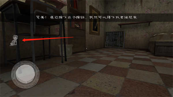 游戏加载完成后,你将置身于一间初始房间。通过左侧虚拟摇杆控制角色移动,点击摇杆上方的小人图标可实现下蹲或站立,便于在狭窄空间或藏身处隐蔽身形。