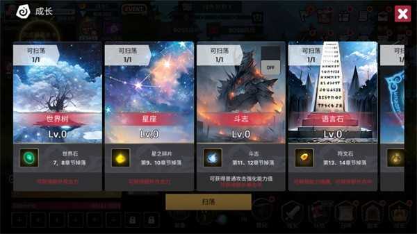 征服:查看当前章节进度与奖励内容,通关指定关卡即可领取丰厚物资,是推进主线的重要动力。