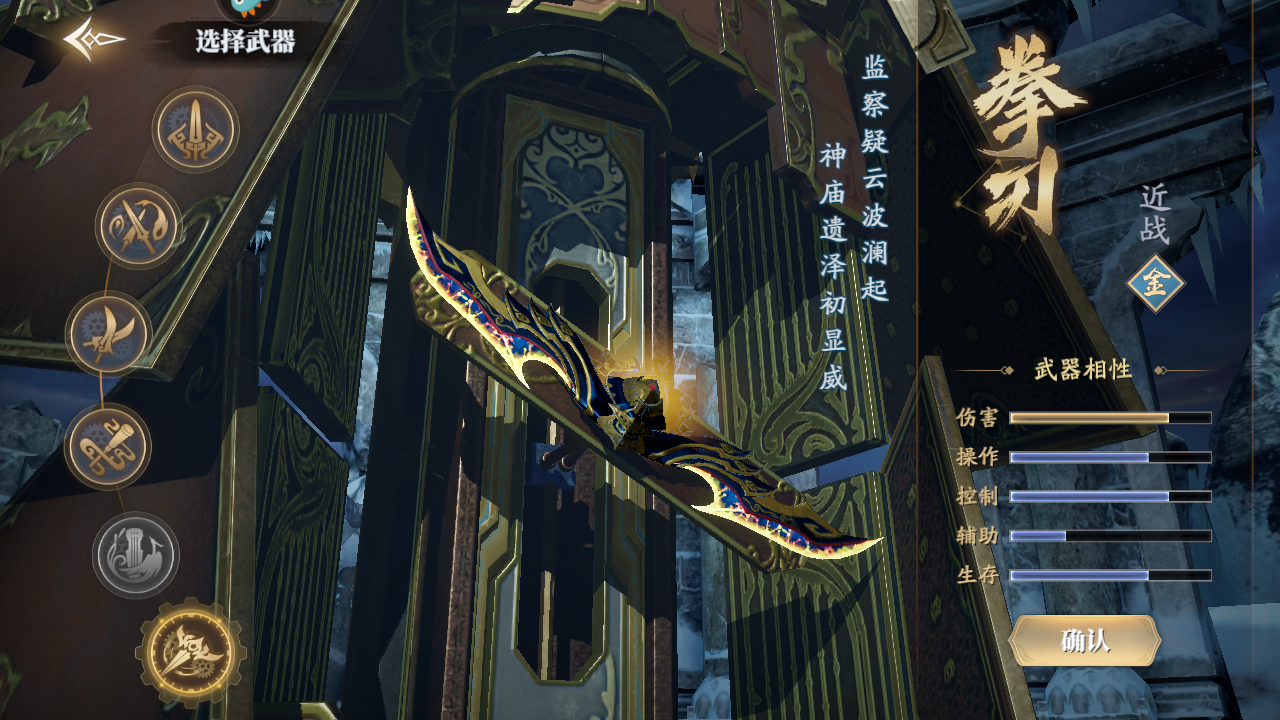 剑:近战均衡之选,招式灵动犀利,伤害突出,正是主角范闲的标志性武器。