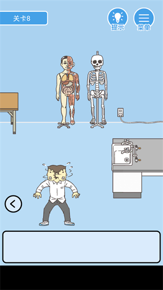 第四关:避开左边柜子里的烟盒,从右侧垃圾桶获取香蕉皮,喂给当画模的同学,再将椅子移到台子上并点击逃脱。
