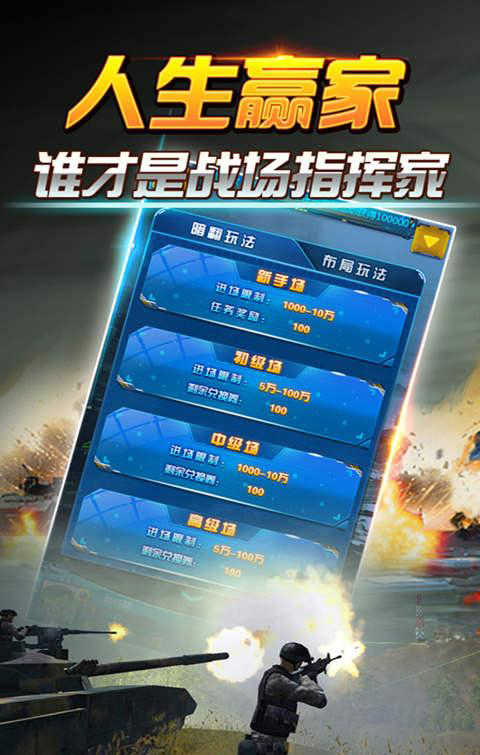 一指定江山,尽在指尖军棋!《天天军棋》超精品画面,全新战斗场面等你加入全新战场!排兵布阵,指点江山,凭个人才智,战略战术,大有驰聘沙场,纵横天下之感。还在等什么!快加入战争!