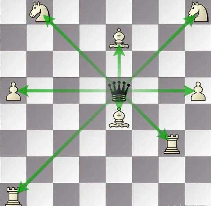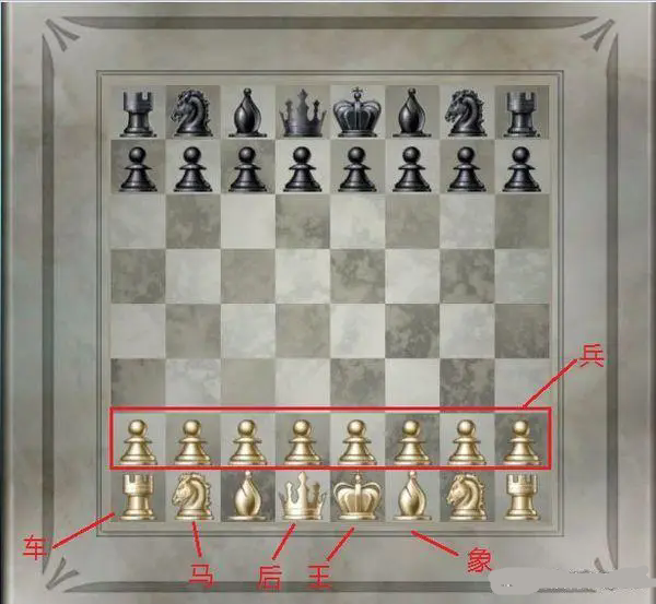 2,后:后可走到它所在的直线,横线或斜线上的任何格子。它是国际象棋中威力最大的棋子。不可越棋子,在它路线上的所有对方棋子都可以吃,但每步只能吃一子,吃完后占据那一格的位置。