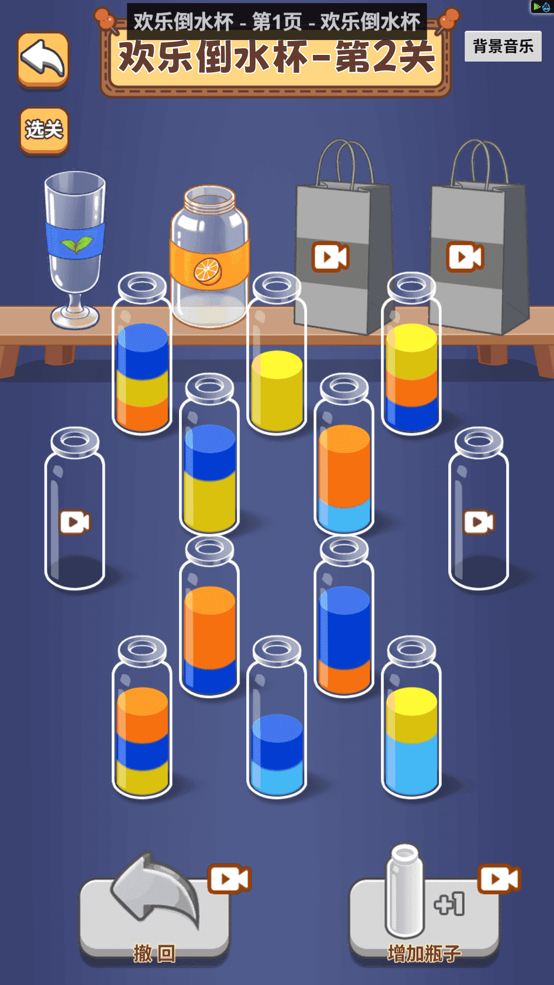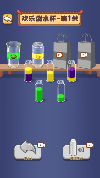 3. 如下图所示,在欢乐倒水杯关卡中,玩家需要将玻璃瓶中的各种颜色水分门别类。