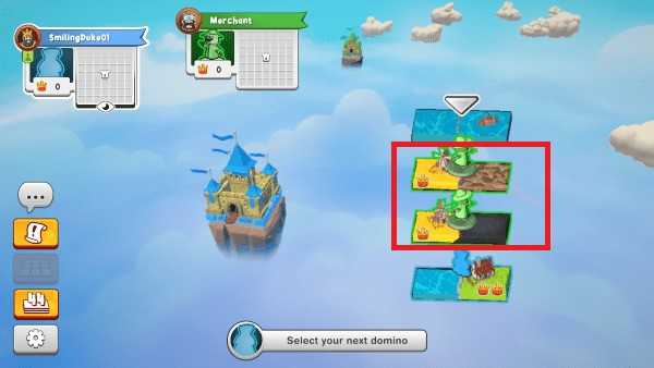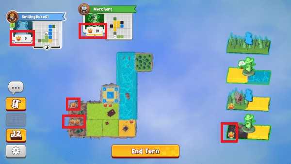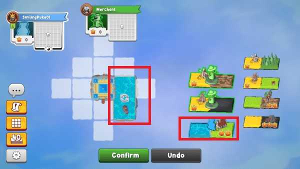 游戏从一块专属城堡地块开始,每位玩家在自己的5×5网格内逐步扩展领地。每回合从公共图块池中选择一块双地形板块,并立即放置到自己的版图中。首块可自由摆放,后续图块必须至少有一边与已有地块的相同地形相邻——但城堡周围例外,可连接任意地形,成为布局的关键支点。