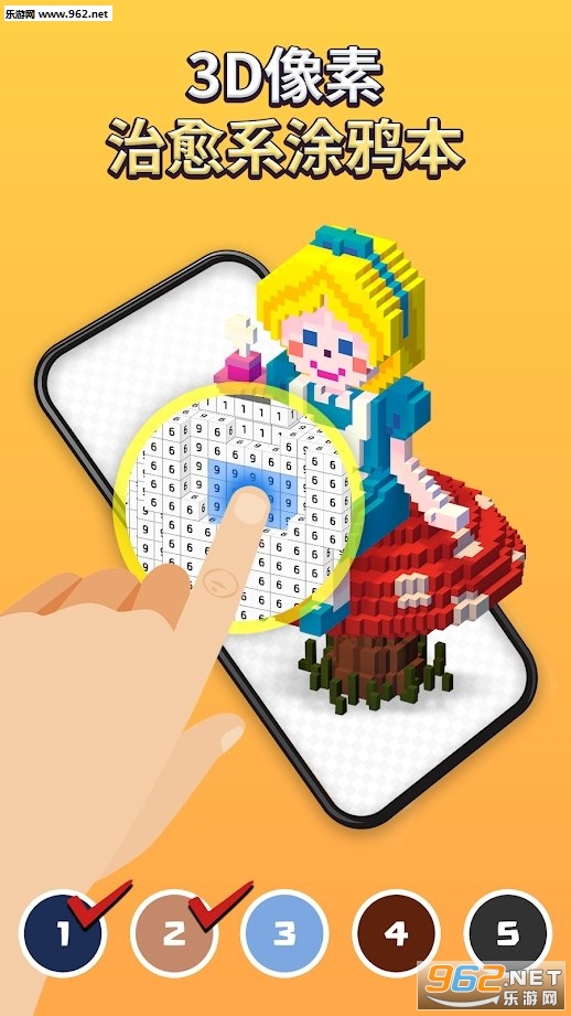 前所未有的3D像素涂鸦本,如童话般的场景会带给你意想不到的幸福,各种各样的3D像素模型会让你的一天无比的快乐。一款针对的涂鸦游戏,静下心来,休息片刻,涂上与序号对应的颜色,选一个你喜欢的作品,一边涂上颜色一边欣赏音乐,通过完成一个又一个涂色本,建造属于你的小小世界吧。