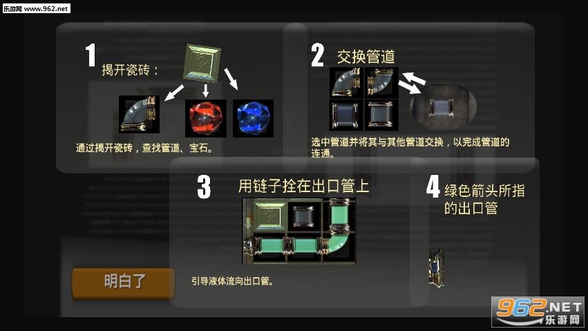 与传统的接水管游戏相比做出了一点改变,水管并不是全部出现在你的面前,你需要去翻瓷砖才能找到对你有用的水管