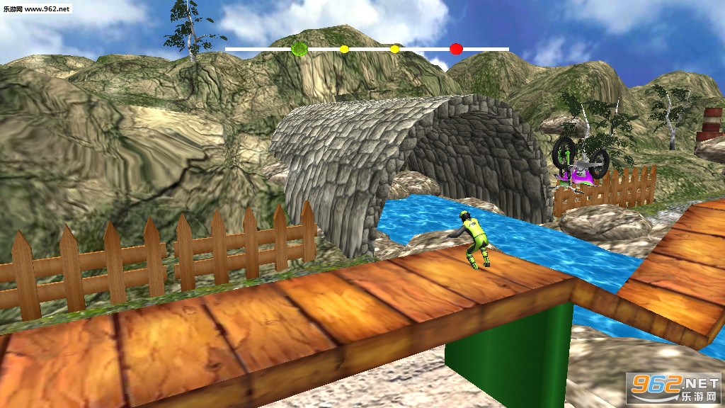 一款非常有趣的摩托车特技游戏,游戏的画面和ui比较的粗糙,但是驾驶的手感和关卡的设计都非常不错,游戏中玩家需要努力的在空中保持平衡,如果有余力还可以进行一些翻转动作来获得更多的分数,游戏的操作简单容易上手,推荐给喜欢摩托车特技游戏的玩家。
