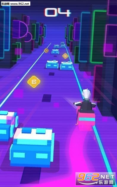 霓虹街机画面,玩家在游戏中扮演一只大鹅开始自己的跑酷闯关旅程,游戏的道具非常丰富,快点骑上你心爱的小摩托冲吧。