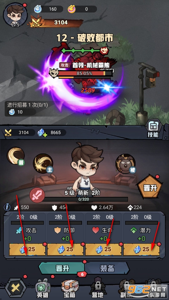 然后使用资源根据自己的喜好提升升级主角属性。