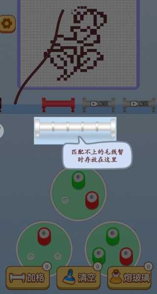 1、游戏开始时先观察线管颜色提示,从下方毛线堆中选取对应颜色的毛线卷,匹配线管颜色后再进行编织操作。