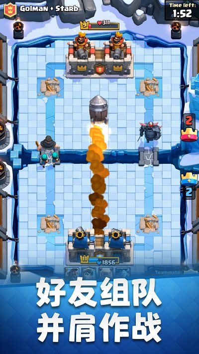 5、您还可以发起对战,打掉对方国王和公主们的皇家塔来获得对战胜利并赢得奖杯,皇冠和荣耀。您也可以建立或加入一个部落,与部落成员相互捐赠卡牌,打造一个属于自己的独一无二的战斗联盟。
