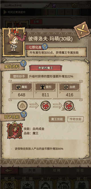 1、将角色彼得洛夫玛萌提升至30级触发七罪化觉醒,可获得50点属性加成及专属技能,同时激活金币产出增益效果;