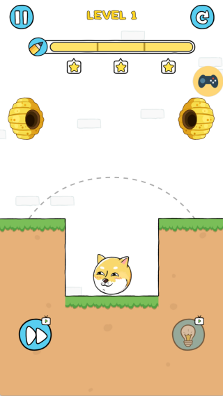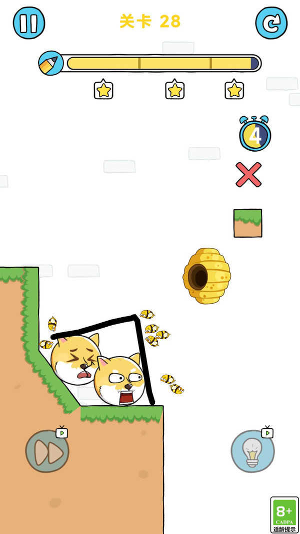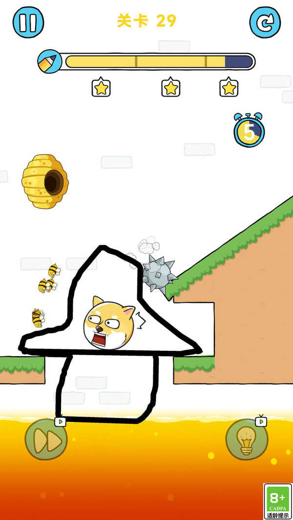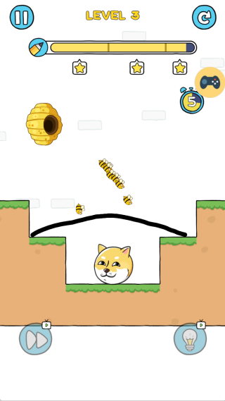 2、通过手指在屏幕上自由绘制线条,这些线条会实体化为狗狗的移动路径或阻挡蜜蜂的墙体,完成绘制后启动关卡验证。