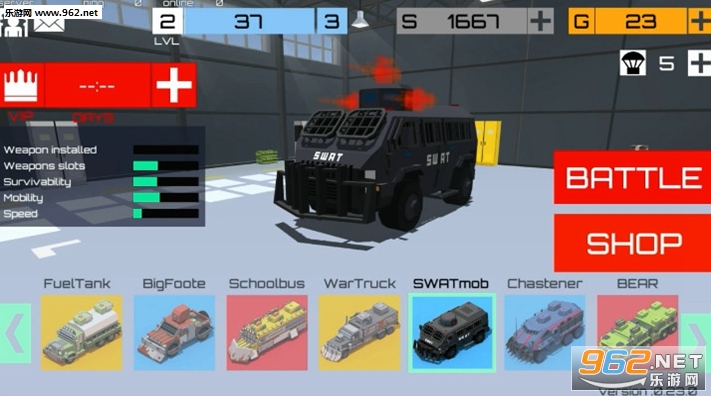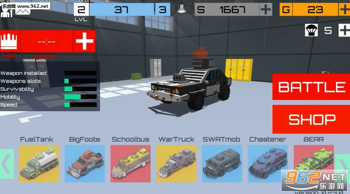 1.在车库里选一辆车。机器上的枪口越多,你在战斗中可以同时拾取和使用的武器就越多。许多武器不会发生,但如果它们已经安装在车库中则更好。如果您选择在车库中安装了工具的机器,您将有更多机会获胜:MARS,校车,锤子,WarTruck或BEAR!