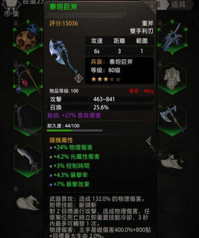 本套反伤BD仅需1把3星泰坦巨斧,无需UR兵装,性价比极高。核心思路是堆血保命,反伤输出”——前期靠战场觉悟”与日曜”过渡,中后期依赖反伤机制,大后期则通过兵装普攻附加伤害收割战场。