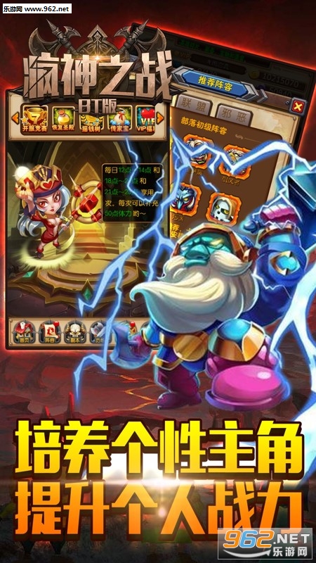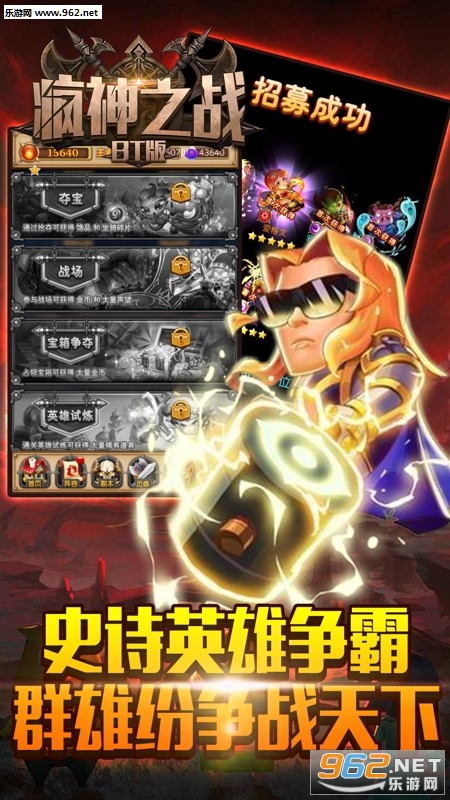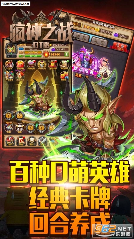 《疯神之战bt》是一款Q版可爱的卡牌回合制游戏,玩法经典重现,带你找回青春的记忆!战场、竞技场,实力对决快意恩仇!百般英雄搭配,千种策略技巧,公会百团大战一触即发,神秘大陆等你拯救,让我们一起谱写英雄史诗战歌!
