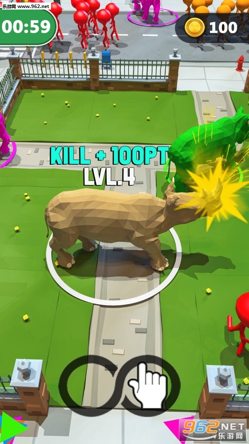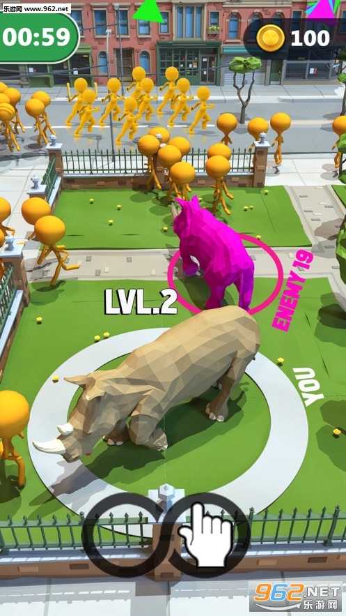 3、控制强大的犀牛并追捕敌方动物,猛攻城市或乡村农场,粉碎一切。