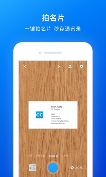 用名片全能王,手机拍照,就能自动扫描,精准识别名片上的信息,快速保存到手机通讯录。
