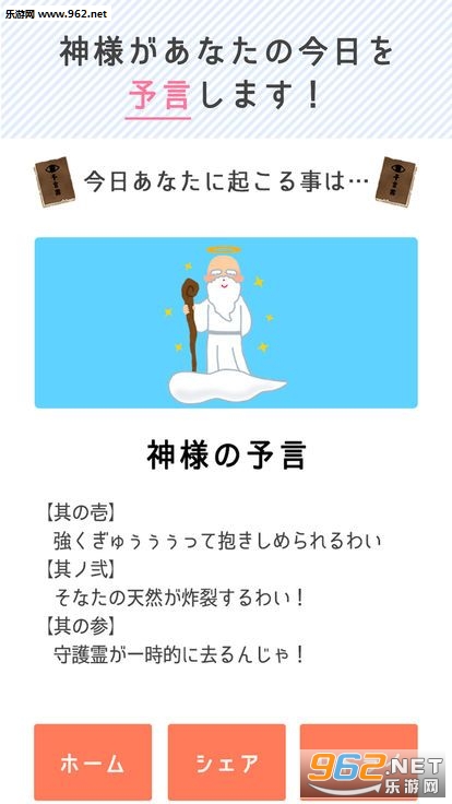《神的预言(神様の予言)》是一个搞笑类型的游戏,模拟成为一个神,对这里所有的人物进行预测,去判断他们的人生,每次诊断的结果都啼笑皆非的,还有一些场景的更换和结果的意外性,每一局的时间都很短,可以随时开随时玩.
