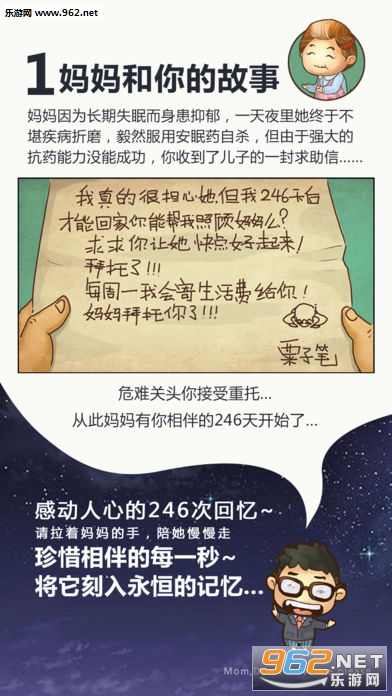 《妈妈别走ios版》这是一款治愈系的情感体验手游。玩家被委托重任,帮助照顾身患抑郁症的妈妈246天,直到她与儿子相聚团员。游戏上手容易,玩法丰富,感兴趣的玩家可以下载体验!