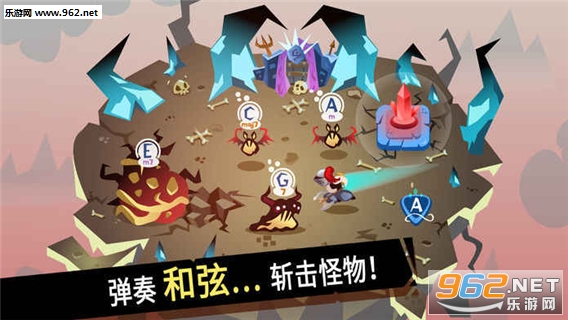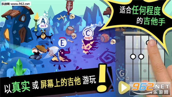 将吉他演奏和冒险战斗结合,在游戏中,不同的吉他和弦谱,将成为各式各样的英雄技能,帮助你更好的消灭敌人。