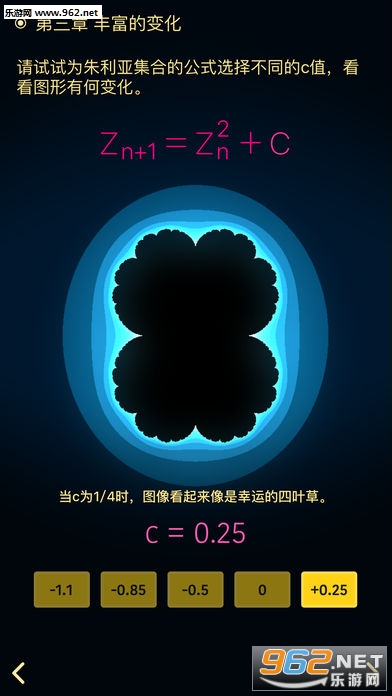 「分形的奥秘」包含三个章节的交互式讲解,引导你一步步探索分形图形的生成原理和变化规律。看上去奇妙而绚丽的分形图形,其实是由非常简洁的数学公式生成出来的。虽然分形数学是一门高深的理论,但在这款应用中,抽象的数学概念已通过直观的可交互图形表达了。因此你完全无需掌握难懂的专业数学知识,就能体会到数学的奥妙。