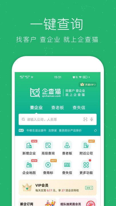·企业查询:支持企业名或人名等关键字的智能搜索,可一键查企业、查老板
