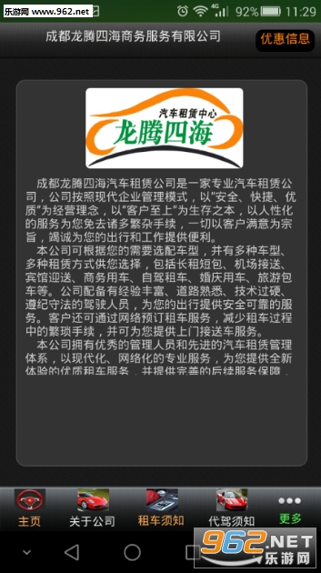 龙腾租车app是一款由成都龙腾四海汽车租赁官网倾力开发设计的非常方便的手机移动租车生活服务软件。有了它,用户可以非常方便快捷地进行汽车临时租赁或长期租赁等服务。它的租车服务范围还覆盖到了镇乡一级,让用户可以随时随地,想租就租。