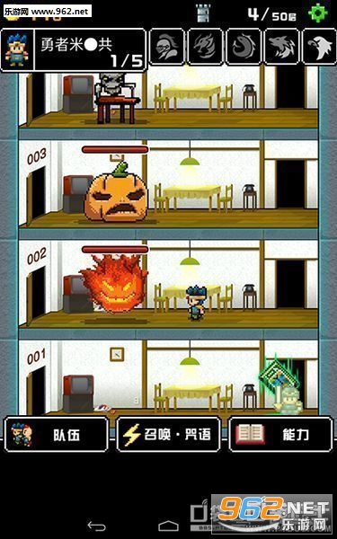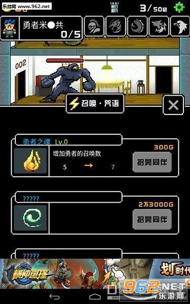1.在不同的塔进行攻略,层层递进,通过打败怪物收集金币来强化勇者自身或者同伴;