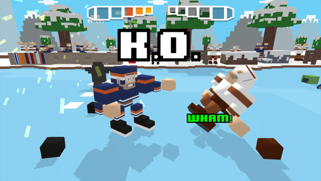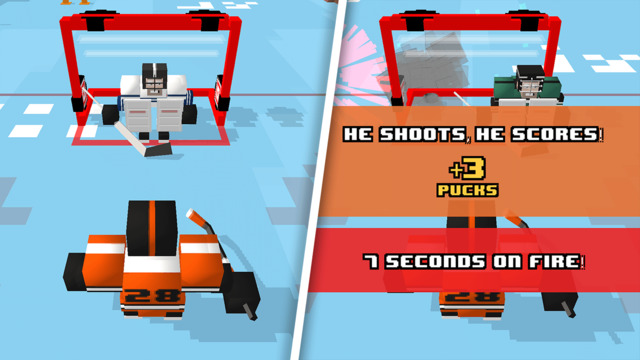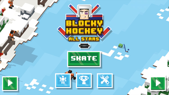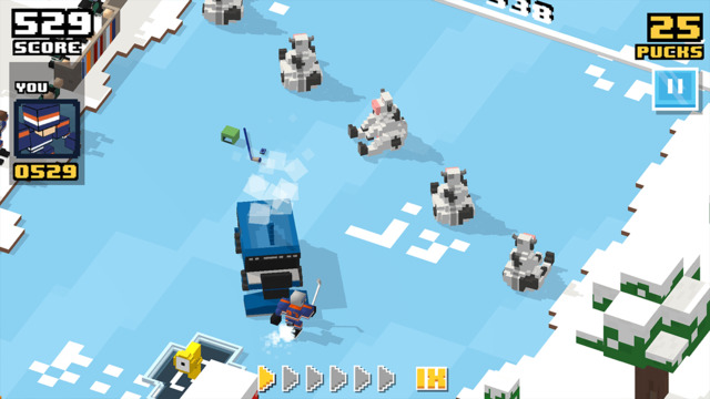游戏的方块画面风格与《天天过马路》很像,但玩法却有很大差别。玩家要操控一个冰球运动员不断前行,通过左右点击绕开障碍,跳过陷阱,避开对方防守队员或者通过打架将其击败,再前进到守门员处通过滑动射门即可得分。