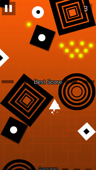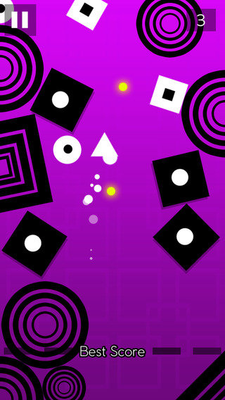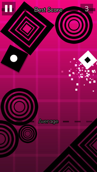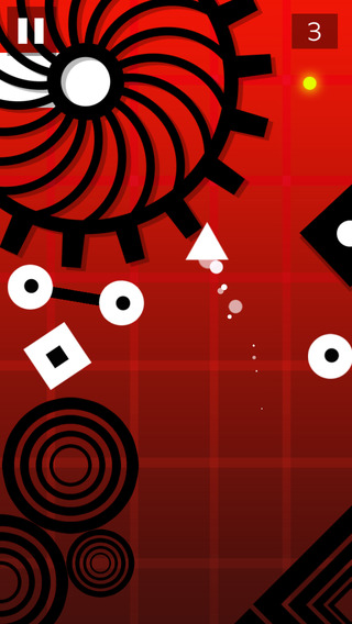值得注意的反而是和小箭头相同颜色的白色障碍物,这些白色障碍物排列较黑色障碍物稀疏,形状也只有圆形和方形,有些还会来回移动。这些白色障碍物是致命障碍,碰不得,一旦碰上就会立马分崩析离,如同节操般碎掉。