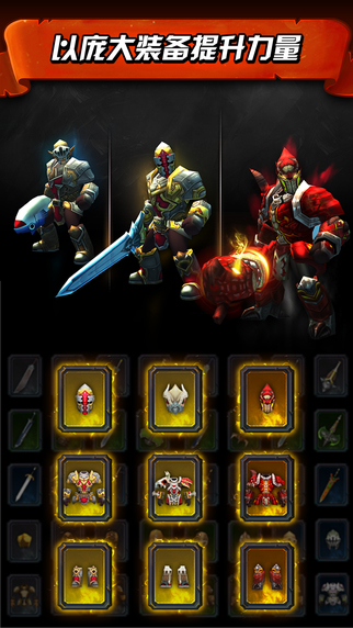 与传统的RPG游戏一样,随着主角不断战胜怪物,获得的经验值予以主角等级的提升,升级后玩家可以在力量、血量和必杀范围上选择升级。而当主角不幸阵亡后,游戏会奖励玩家各种金币宝箱,收集金币可以购买装备宝箱来强化主角的战斗、生存能力。游戏中还提供了各种成就目标,每当玩家完成就可获得不菲的高级宝箱奖励。