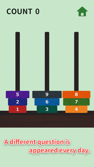 游戏的规则与现实中的实体玩具别无二致,就是要移动画面中的圆盘,让它们按照从上到下由小到大的规律摆放。唯一的限制是在移动过程中,大圆盘不能被放到比它小的圆盘上面。玩家的任务,就是尽可能在最少步数内成功通关。