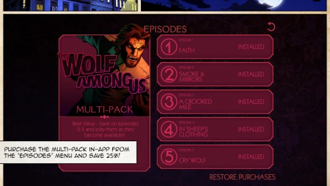 从游戏的主界面上可以看出游戏将发行5个章节,分别是信仰 Faith、镜中迷雾 Smoke and Mirrors、曲折的一英里 A Crooked Mile、绵羊衣服中的秘密 In Sheep’s Clothing以及哭泣的独狼 Cry Wolf,内容非常的丰富。
