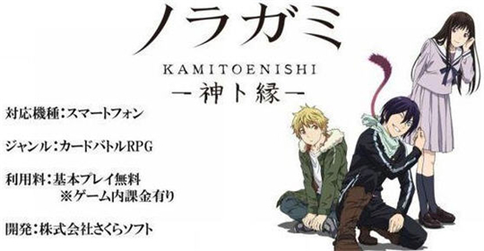 《野良神神与缘》是一款由人气动漫野良神改编的手机游戏,游戏类型将会为卡牌对战,不过也有点角色扮演元素在其中,是由日本Sakurasoft推出,据了解,游戏里面将会出现夜斗、雪音、毘沙门天等角色,这些都是大伙熟悉的人物,从游戏画面来看,设计还是不错,很有画质感。