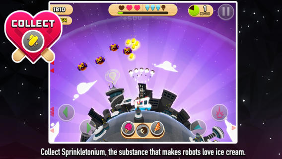 《机器人爱冰淇淋》(Robots Love Ice Cream)光听名字就足见有爱程度。在游戏中玩家会被带到一个相当精致可爱的星球,上边会有很多好吃的美食,然而有一群机器人一直对这些美味虎视眈眈,玩家要做的就是驾驶一辆改装过的冰淇淋售卖车,开到对应位置向这些机器人发起攻击,有意思的是发射的炮弹不是别的,而是各种口味的冰淇淋。