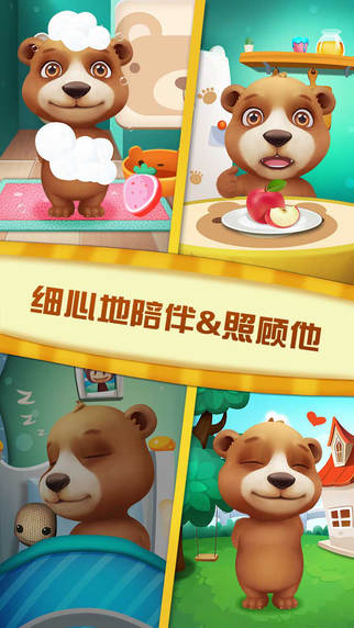 照顾好比比熊:陪他玩,喂他好吃的,给他洗澡,哄他睡觉,他会高兴、饥饿、犯困、不耐烦......他的情感会随着你和他的互动而变化。
