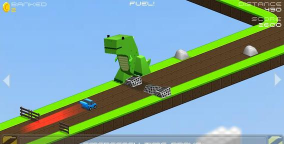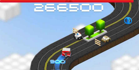你只需要或左或右的控制小拉力赛车在固定的轨道内行驶。别以为这是一件容易的事,因为俯视角的关系,在出现大弯道或是奇葩障碍的时候对位置判断很容易失准,这也成为了这款游戏的趣味点之一。当然,场地里各种土坑、方块树、牛奶大卡车等更让我们的赛车之旅充满挑战,多使用“紧急刹车”会在紧要关头救你一命。