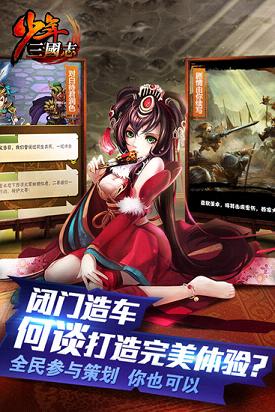《少年三国志》突破传统卡牌的人物羁绊等设定,加入真正的酷炫合击技能和畅快连击体验。带给你视听一体的酷爽体验!你不仅能遍阅三国英雄的少年辉煌,还可以亲自参与产品制作环节!