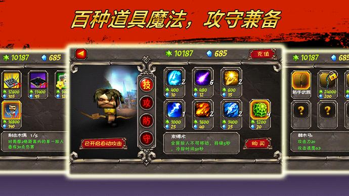 陷阱升级多变的战法,绚烂的大型魔法,或可爱或华丽或诡异的装备武器造型,各种奇思妙想的道具,火爆的战斗场面,让玩家全方位体验不同的新式塔防策略。