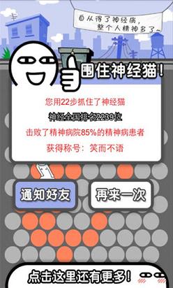 《围住神经猫》是一款虐心的休闲手游。小伙伴们的朋友圈被一款名为“围住神经病猫”的小游戏刷屏。这只露着屁股、腰身细长的白猫,在手机屏幕中贱贱地扭动腰肢,一副欠扁的模样。这是一个类似五子棋的小游戏,不同的是,围堵的对象变成了一只“神经病猫”。当用户围堵住这只猫时,会出现一个分数值,显示你击败的全国人数比。