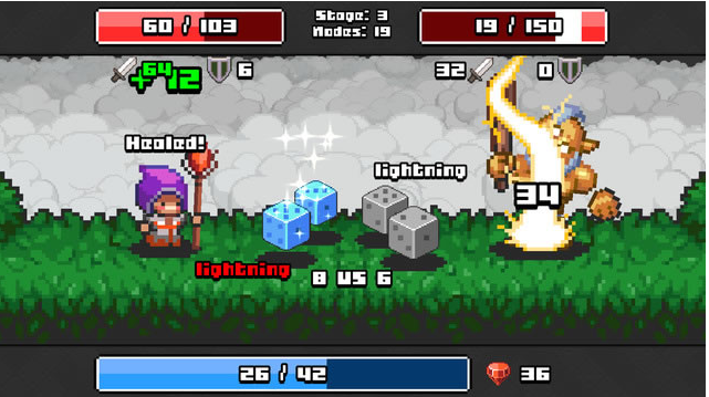 本作的画风是经典像素风格,让玩家想起了当初玩FC小游戏的恐(hui)惧(yi)。另外游戏中任何一个因素都与运气有关,PK的先后手有骰子决定,攻击数值由骰子决定,甚至是获得的道具奖励,也由骰子决定。在这个游戏里面,讲的不是实力,儿时运气,孰是谁非,看玩家自己咯。