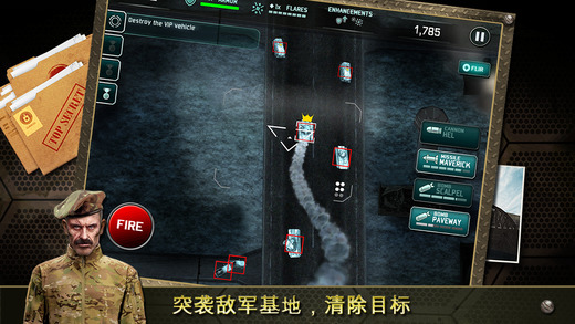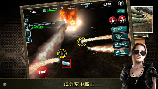游戏中的操作并不复杂,只需要滑动屏幕来回移动视角,发现目标,然后按FIRE攻击即可。当然有的时候还需要切换一下是用机枪还是用导弹。随着你无人机的升级,可用武器和性能也会产生一些不同的变化。