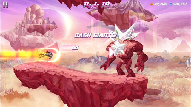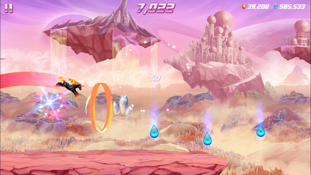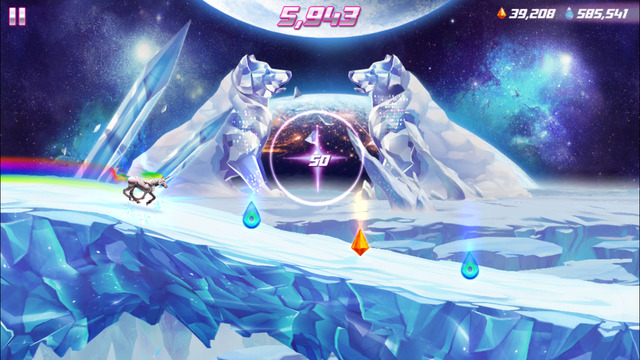 独角兽在游戏中需要收集水滴和带有精灵标志的道具,并完成规定任务。收集的“水滴”可用来购买特别的“冰川世界”等场景。玩家在不断向前奔跑时,也不要错失这些物品。至于游戏的玩法,算是比较简单的。一左一右两个虚拟键分辨代表跳跃和猛冲,简单易上手。由于处在不断跳跃的状态下,有些地方需要玩家连击跳跃键,才能稳稳地落地。还要注意的是,有时会遇到坚固的路障,玩家要及早做好猛冲的准备,才能顺利穿破障碍物。其实,本作在玩法上跟同类游戏没多大区别,只要你玩过《神庙逃亡 Temple Run》这类游戏,玩起来并不会有很大的难度。9分完全是由于跑酷游戏一目了然的玩法。