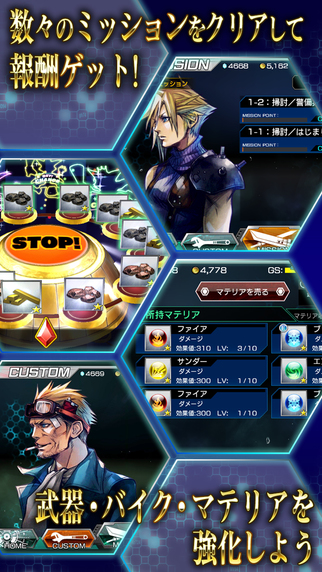 和传统的跑酷不同,《最终幻想7 G-BIKE》仍然拥有非常浓厚的RPG要素,装备的强力程度仍然判定着你是否能通关的基准之一,在CUSTOM页面里,你可以针对克劳德进行装备和魔法技能的变更和强化,还可以对克劳德的机车进行改造,甚至是为克劳德配备更好的机车,而强化所使用的材料都将在关卡里获得或者是通关之后的随机奖励之中获得,机车方面也有等级,总的来说,强化克劳德本人可以增强其武器攻击和生命数值,而强化机车则可以提升加速等方面的能力,值得一提的是,SE还为我们挖了一个非常大的坑,那就是关于制造内容,为了制造出更好的武器和机车,你得不停的重复刷关以获得制造这些装备所需的材料,而每进行一关需要消耗GS值,GS值又联系到内购商店里的消费,这一连串的关系,也正是表明了SE在设计上的&39;&39;老奸巨猾&39;&39;。